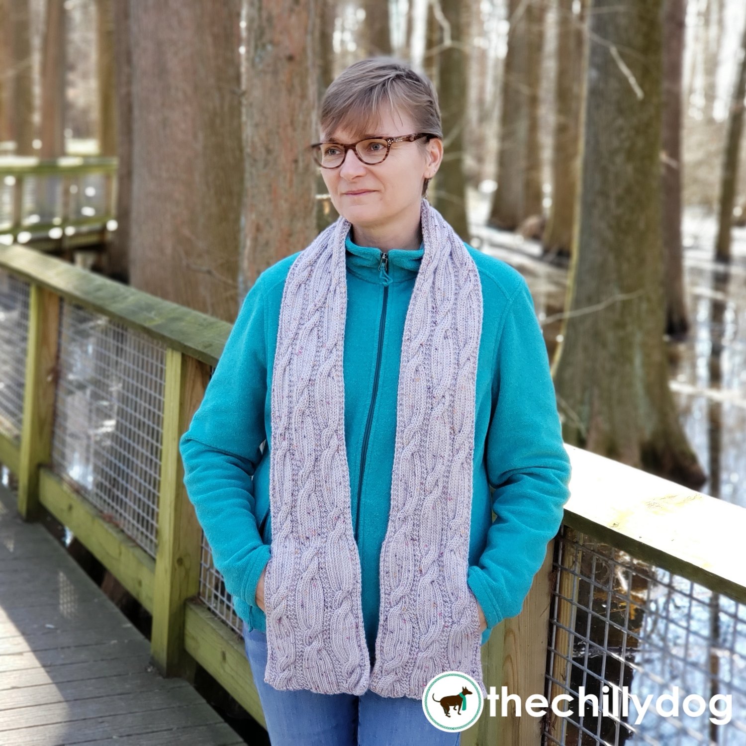 With concealed, side-entry pockets, this scarf with wide, ribbed cables is sure to become a cold weather favorite.