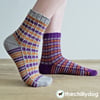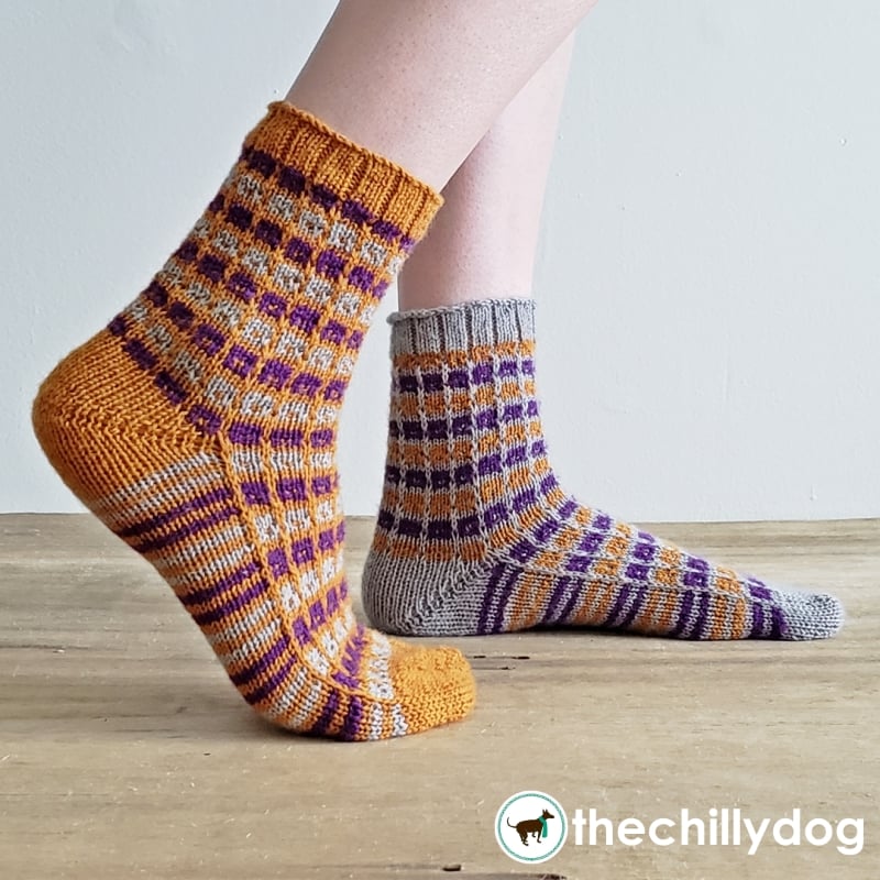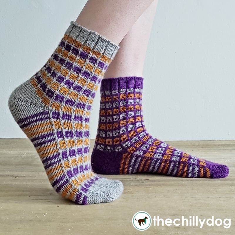 The socks feature a boxy, mosaic (slipped stitch) design. If you are new to mosaic colorwork, it is basically like knitting stripes with a few strategically placed slipped stitches. You are only working with one color of yarn at a time. The mosaic motif is charted.