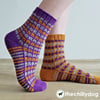 This pattern is a playful experiment in color theory. The trio of coordinating "mismatched" socks is created by rearranging the order of three contrasting colors when you knit each sock.