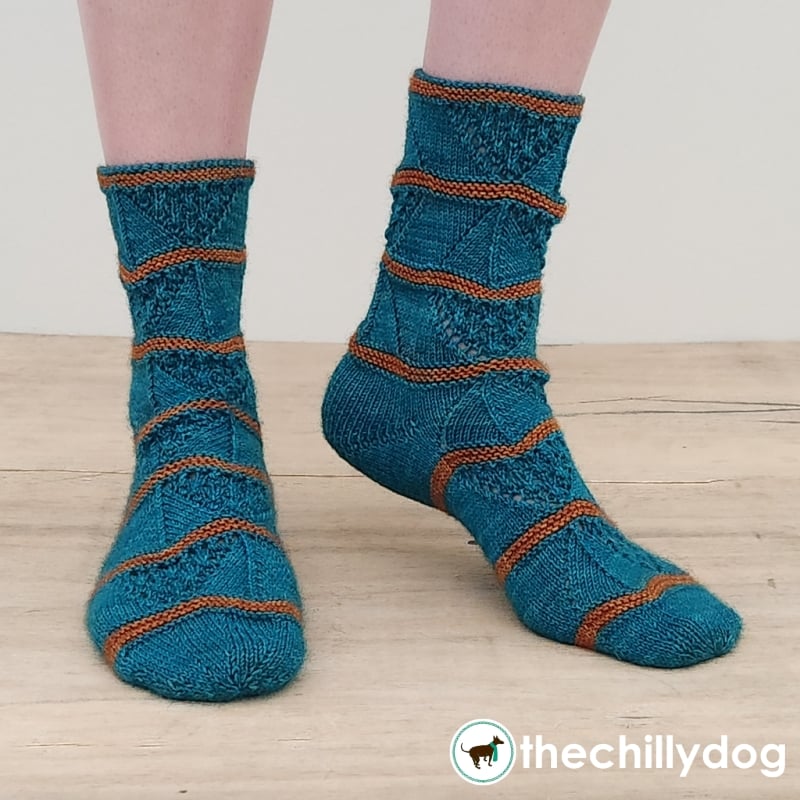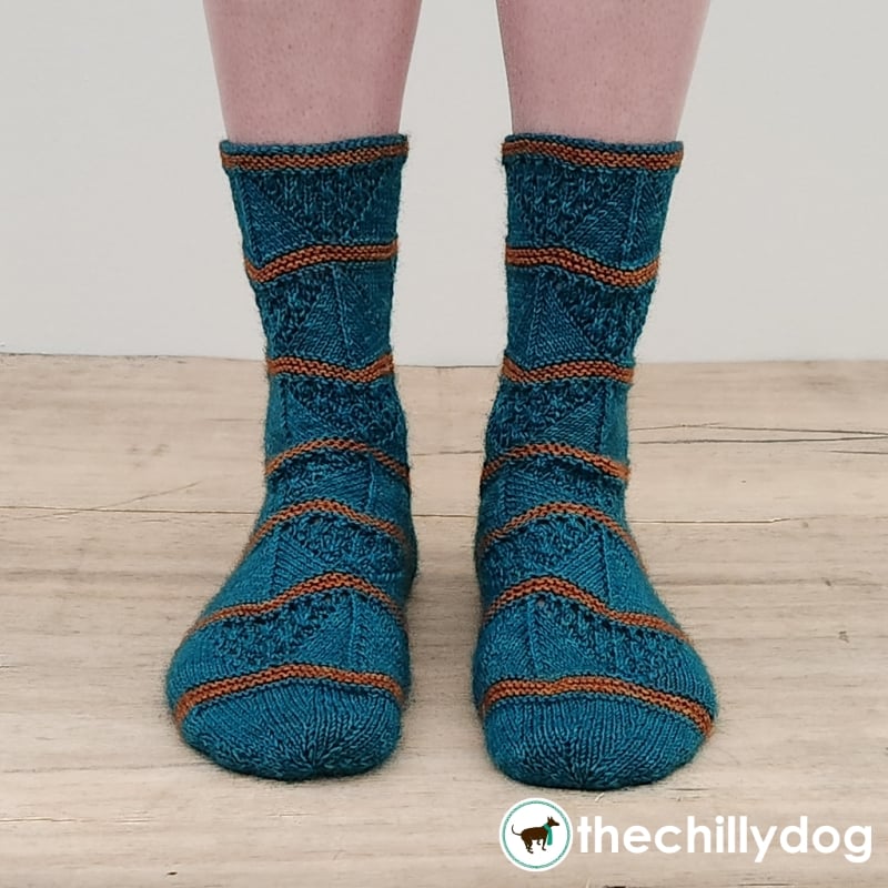 These toe-up socks were inspired by the Muscovy ducks who waddle around the Treasure Goddess Yarn studio. Duck prints walk their way down the socks. Contrasting garter ridges add a pop of color and texture. The socks have short row heels and star toes.