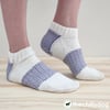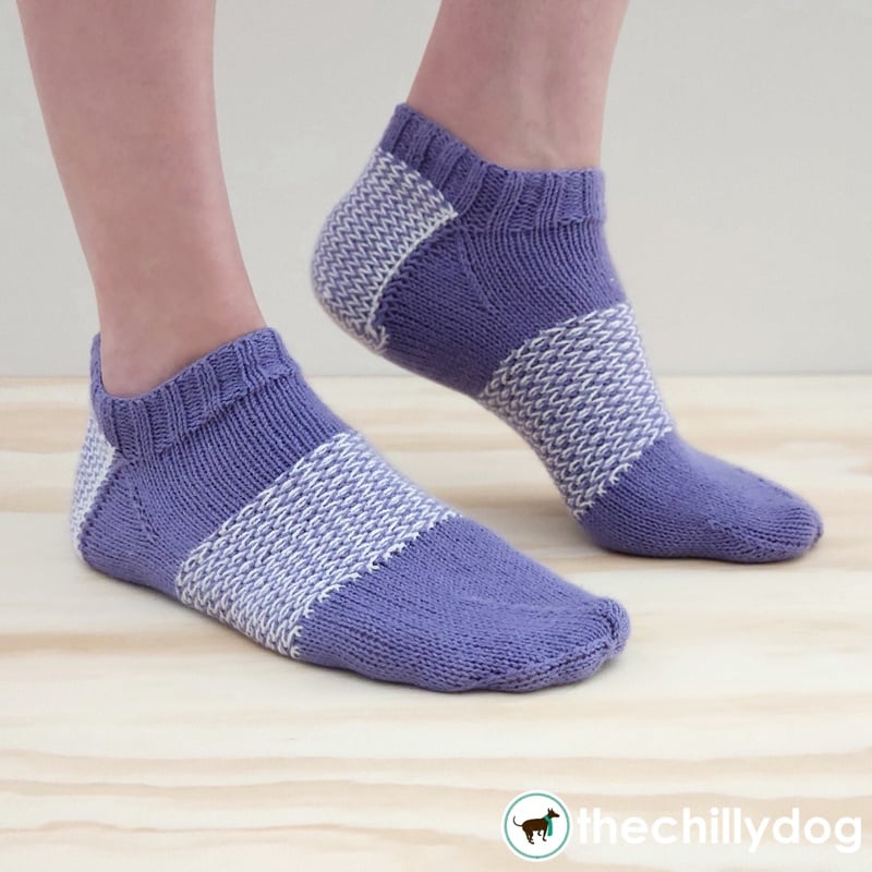 These summery ankle socks are knit from the top down, have a square turn heel and a propeller toe. Twining is used to create an interesting color pattern and dense, cushioned fabric that gives extra comfort and support to the heel flap and turn heel as well as the footband around your arch.