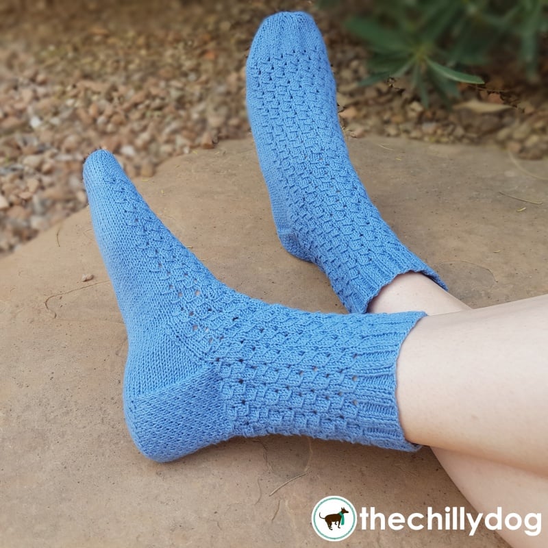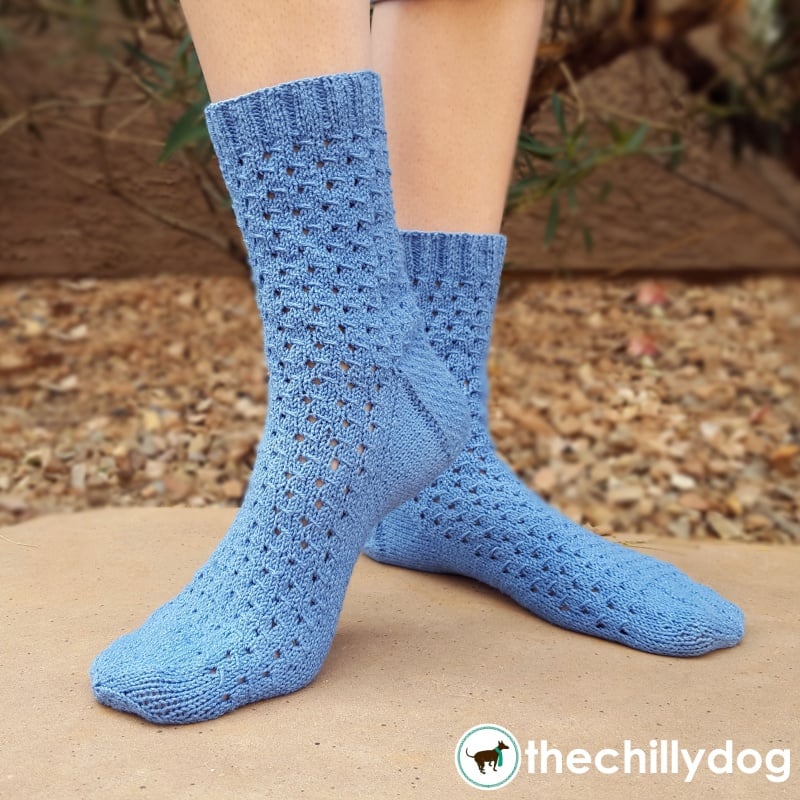 A feminine, breathable sock knitting pattern for warmer weather. These socks are knit from the leg down with an airy eyelet design, Eye of Partridge heel flap, traditional French turn heel and a star toe. There is no Kitchener grafting.