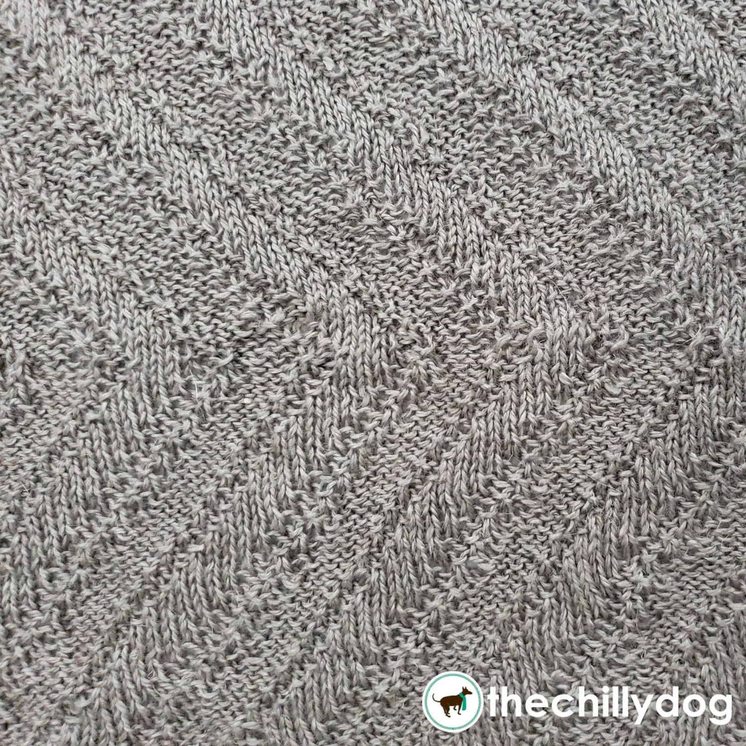 This shawl is knit in the round on 60 inch long circular needles. It has a simple repeated, 12 stitch pattern that creates mirrored diagonal stripes. The stitch pattern has both charted and written instructions.