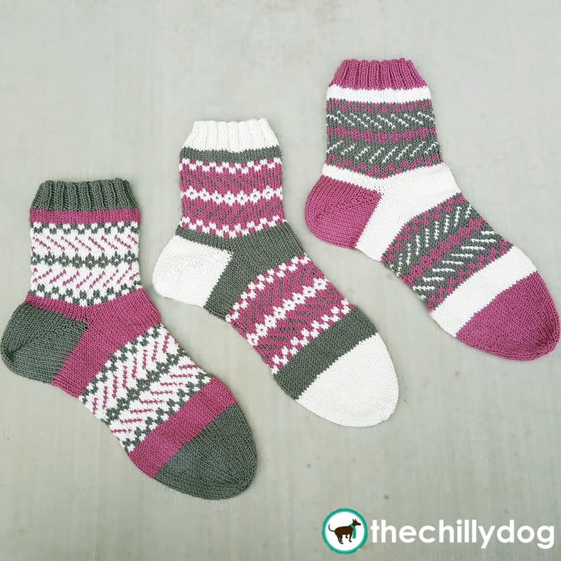 This unconventional sock knitting pattern is for a trio of “mismatched” socks. The socks have a simple, three color pattern and are worked in the round, from the top down, with Shadow Wrapped short row heels and star toes. The yarns can be carried through the colorwork section. For comfort, rounds begin at the side of the sock so the carried strands are on the side of the foot instead of the sole.
